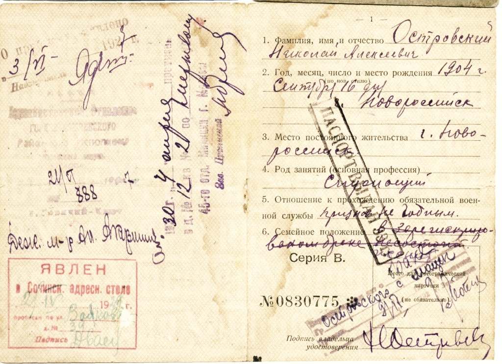 Удостоверение личности Н. А. Островского