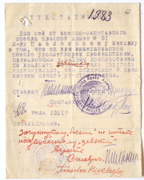 Аттестат № 1383 доктора М.К. Павловского, служившего при военно-санитарном поезде Красной Армии № 31. Синельниково. 28 июля 1921 года.
