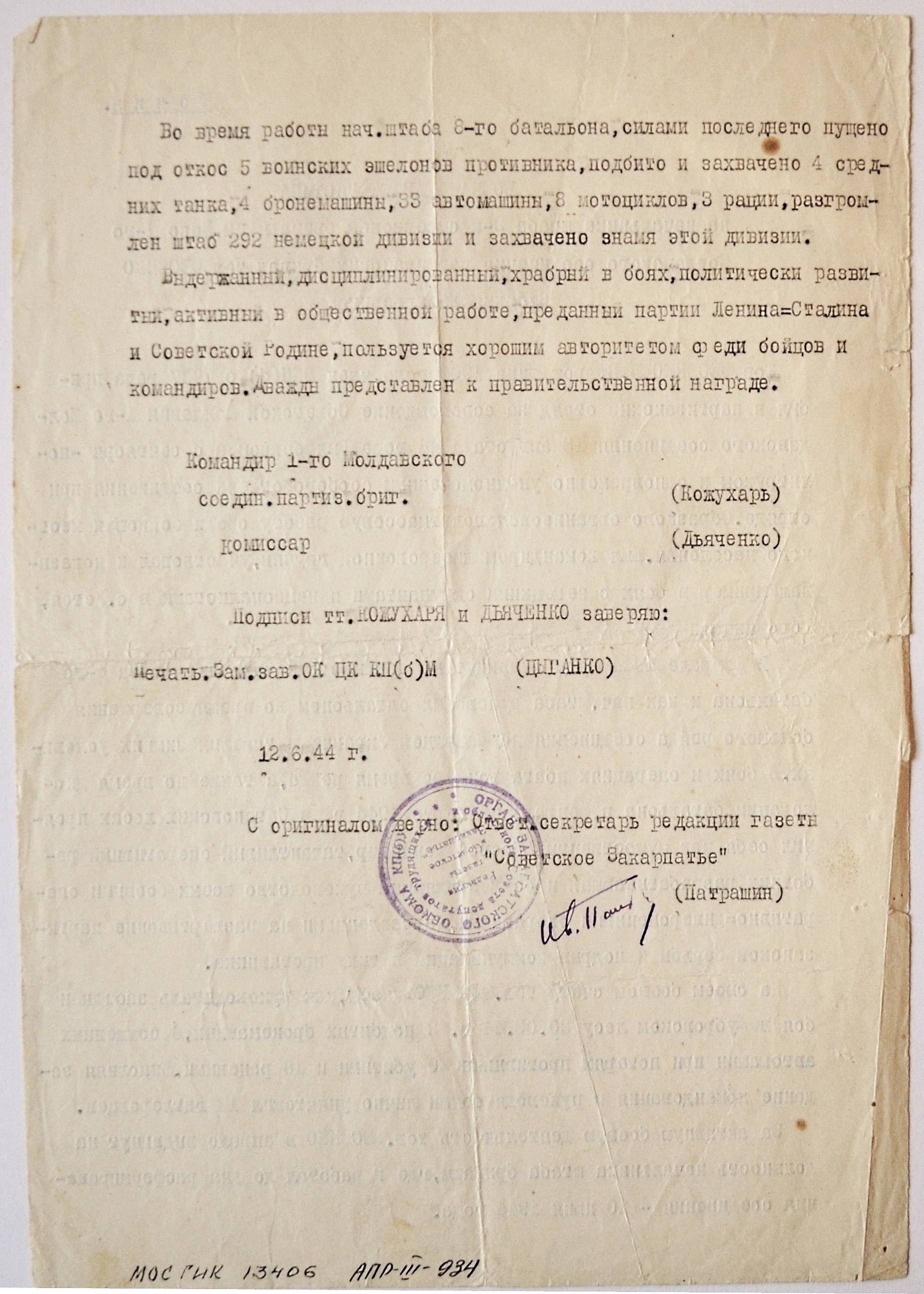Боевая характеристика на Василия Васильевича Фесенко, начальника штаба 2-ой стрелковой бригады им. Лазо 1-го Молдавского соединения партизанских бригад. 1л.‒2 с. Заверенная копия. 12 июня 1944 года.