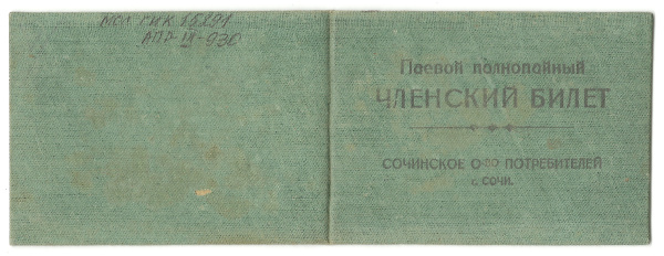 Паевой полнопайный членский билет № 2377 Бурматовой Е.Д., служащей. Сочинское общество потребителей. 10 января 1935 года.
