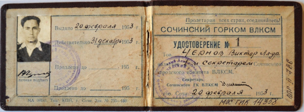 Удостоверение № 1 Чернова Виктора Александровича, 1-го секретаря Сочинского горкома ВЛКСМ. 20 февраля 1953 года. Действительно по 31 декабря 1953 года.