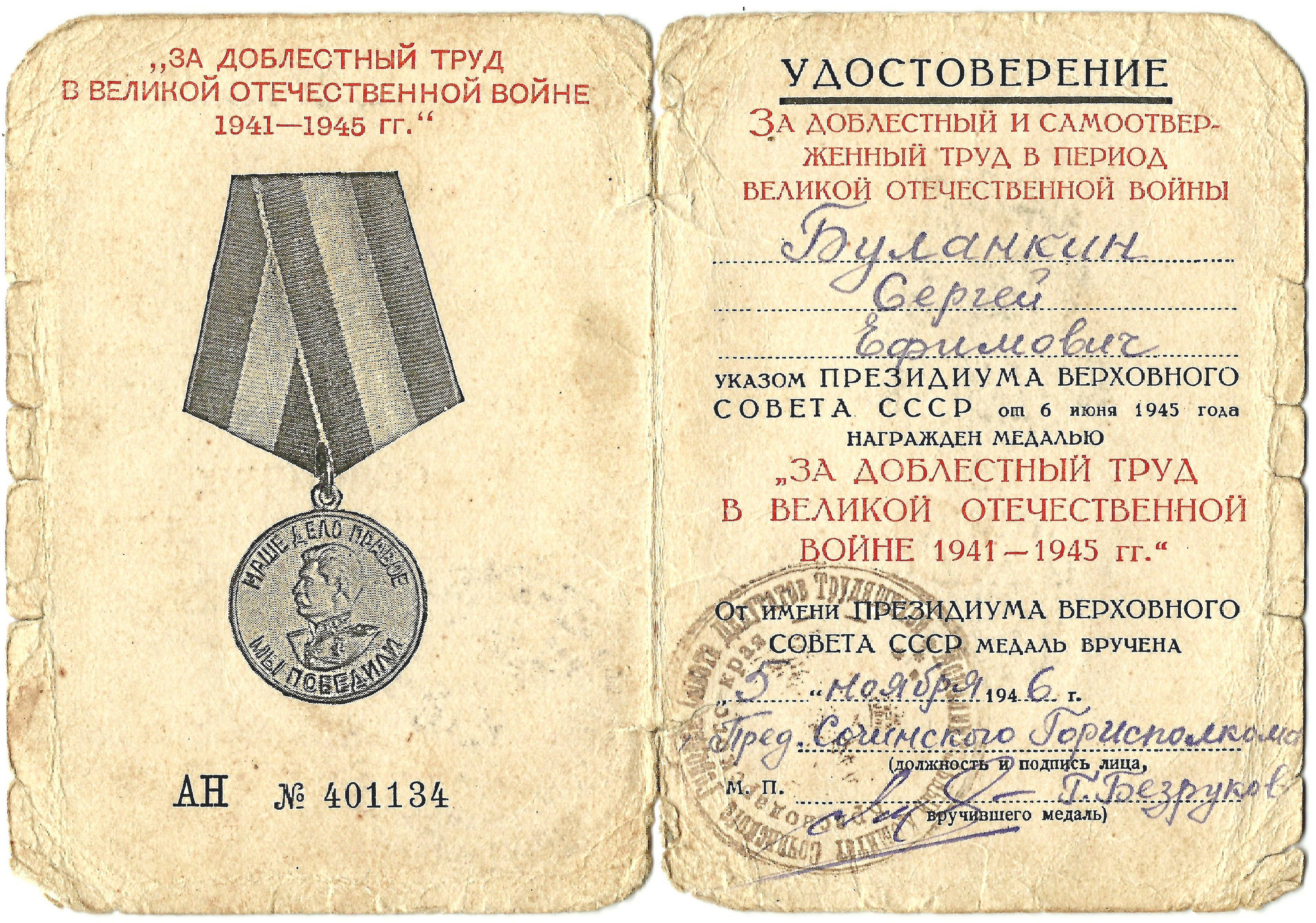 Удостоверение АН № 401134 Буланкина Сергея Ефимовича, Указом Президиума Верховного Совета СССР от 6 июня 1945 года награжденного медалью «За доблестный труд в Великой Отечественной войне 1941-1945 гг.». 5 ноября 1946 г.