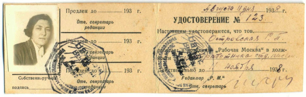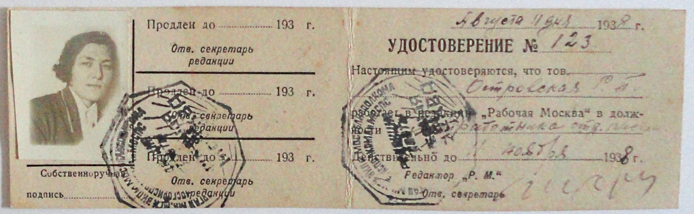 Удостоверение № 123 Раисы Порфирьевны Островской, литработника отдела писем газеты «Рабочая Москва». Выдано 11 августа 1938 года. Действительно по 11 ноября 1938 года.