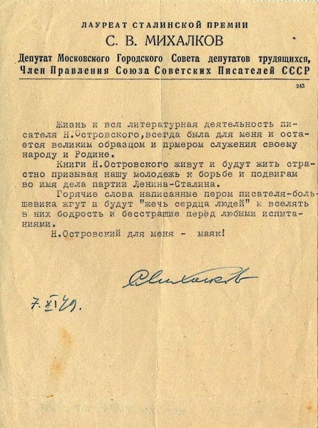 Михалков С.В. «Жизнь и литературная деятельность писателя Н. Островского всегда была для меня и остается великим образцом <…> Книги Н. Островского живут и будут жить <…> и будут „жечь сердца людей”<…> Н. Островский для меня — маяк! С. Михалков. 7.XI.49.». Отзыв о судьбе и творчестве Н. Островского. 7 ноября 1949 г. Машинопись. 1л.