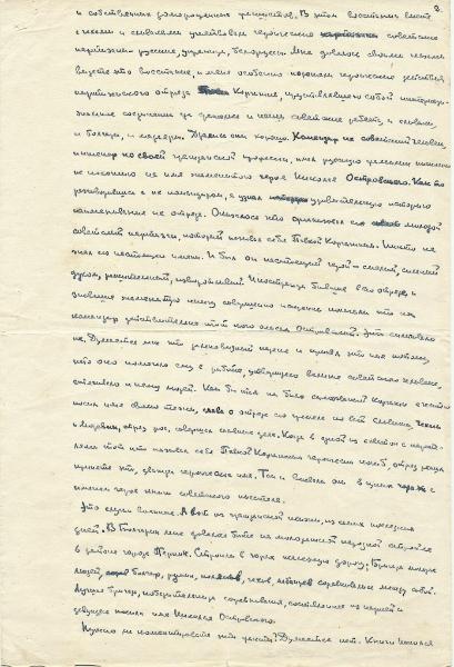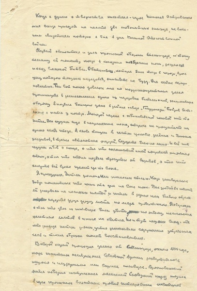 Писатель рассказывает о том, как в дни Сталинградской битвы бойцы читали у костра роман «Как закалялась сталь»; о боевом пути в Словакии интернационального партизанского отряда имени Павла Корчагина; о лучшей бригаде на строительстве железной дороги в Болгарии, которой было присвоено имя Корчагина/. 10 сентября 1949 г. Рукопись. 3 л.