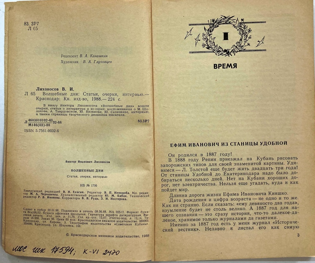 Лихоносов В. Волшебные дни. Статьи, очерки, интервью. Краснодарское книжное издательство, 1988. 224 с.