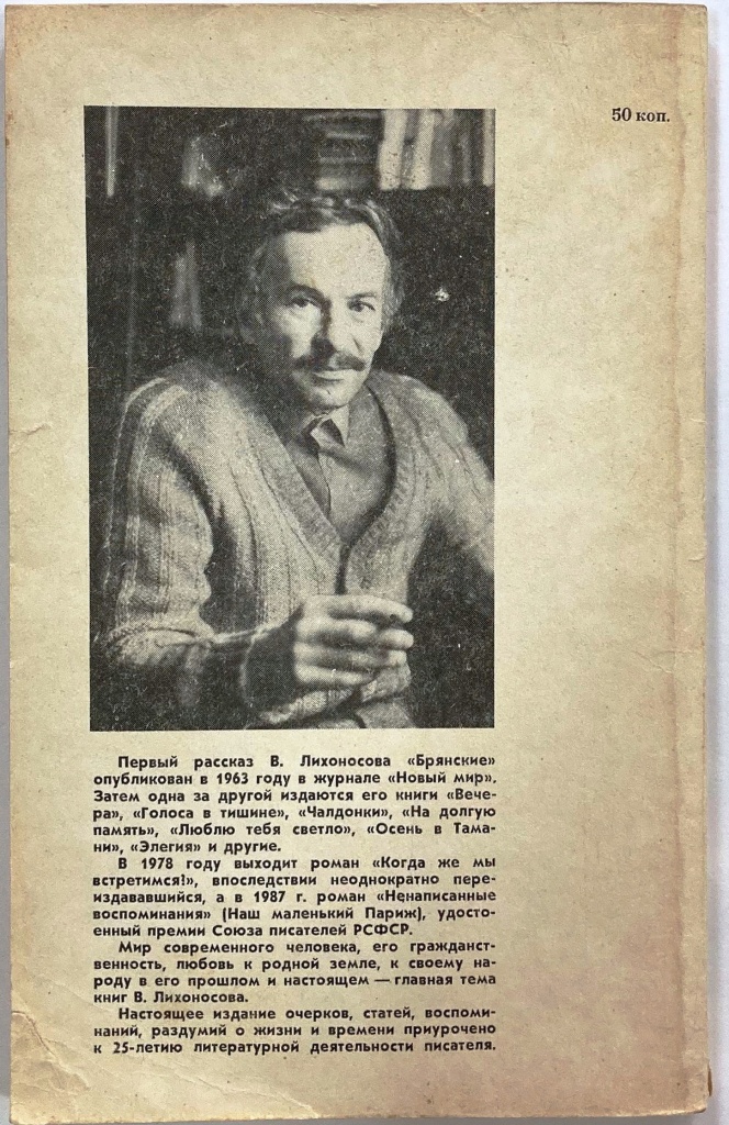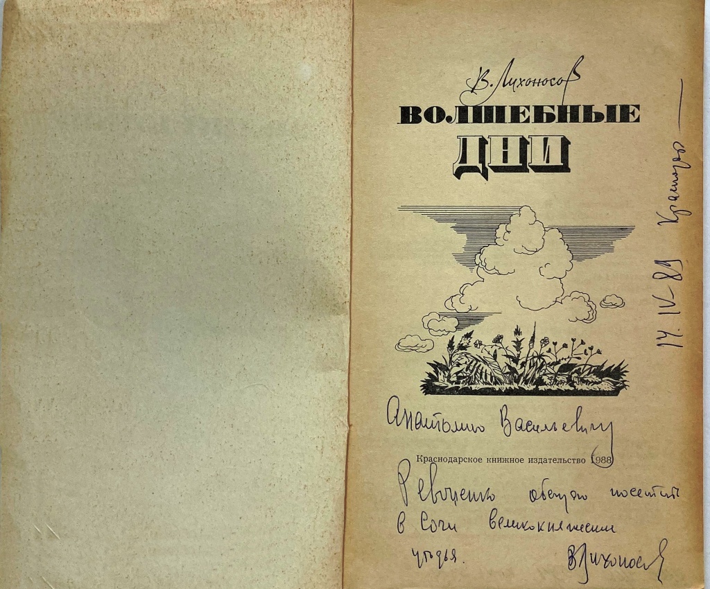 С автографом автора: «Анатолию Васильевичу Ревоненко обещаю посетить в Сочи великокняжеские угодья. В. Лихоносов. 14. IV-89 Краснодар».Книга передана в музей из личного архива А.В. Ревоненко.