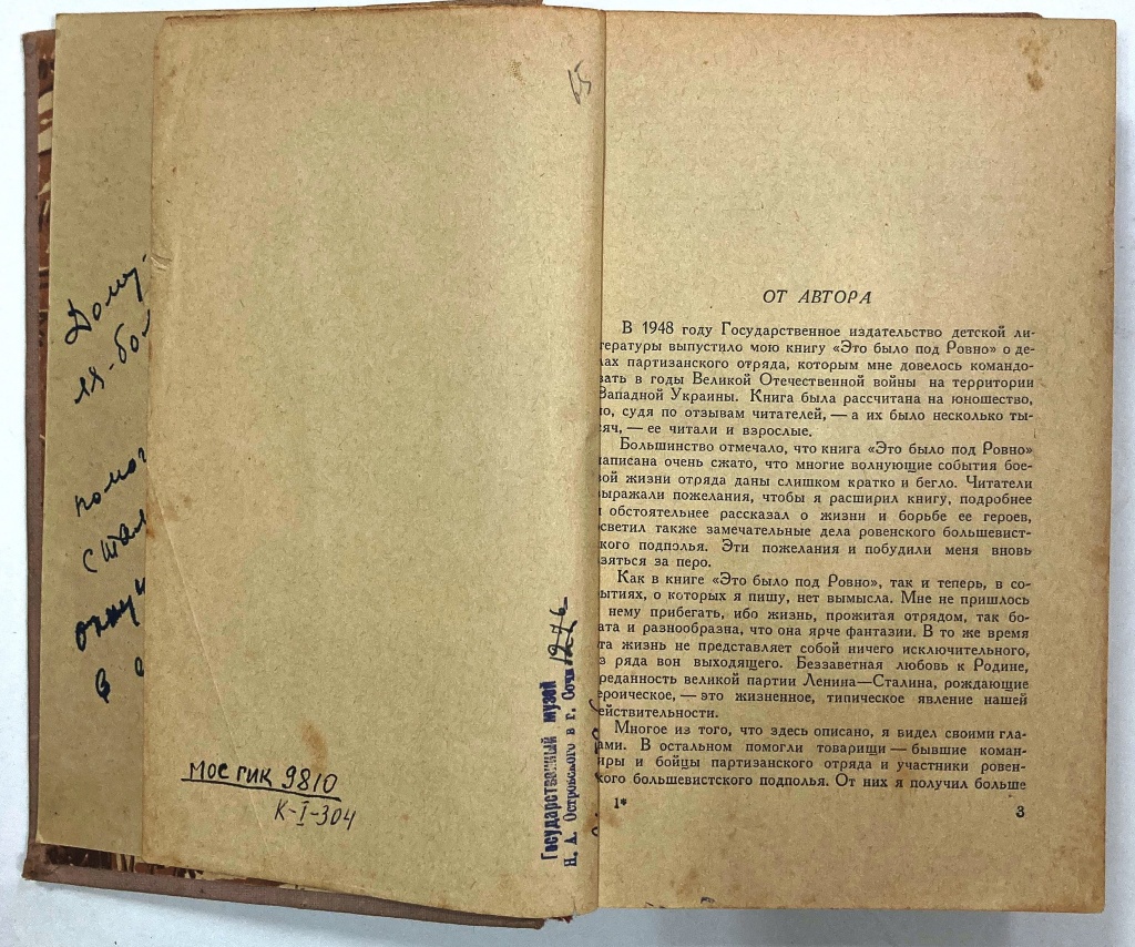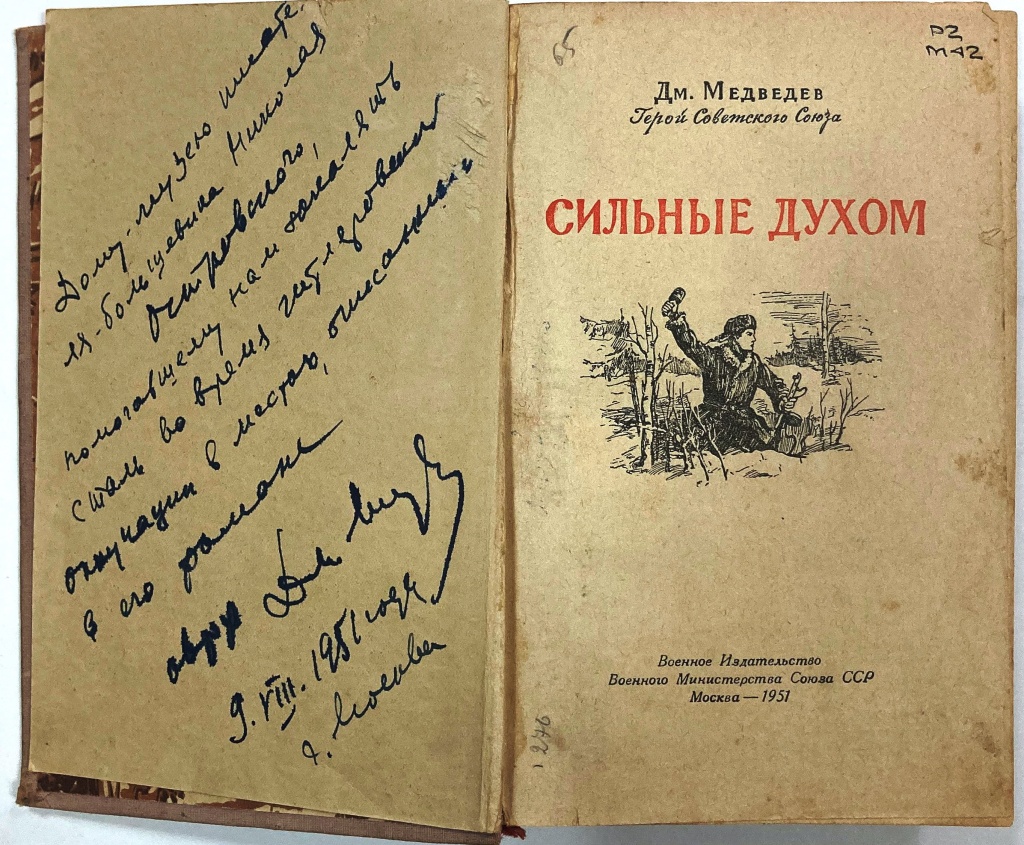 С автографом автора: «Дому-музею писателя-большевика Николая Островского, помогавшему нам закалять сталь во время гитлеровской оккупации в местах, описанных в его романе. Автор Д. Медведев /подпись личная/. 9.VIII.1951 года. г. Москва».