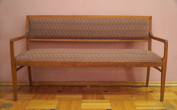 Диван-канапе с жесткими подлокотниками и мягкой обивкой из мебельного репса; дубовый. Часть мебельного гарнитура, изготовленного для кабинета писателя на Дагомысской мебельной фабрике Сочи по заказу городских властей.