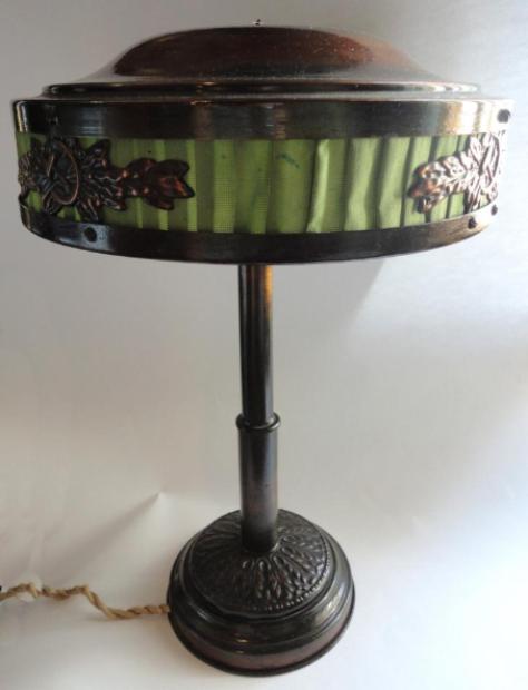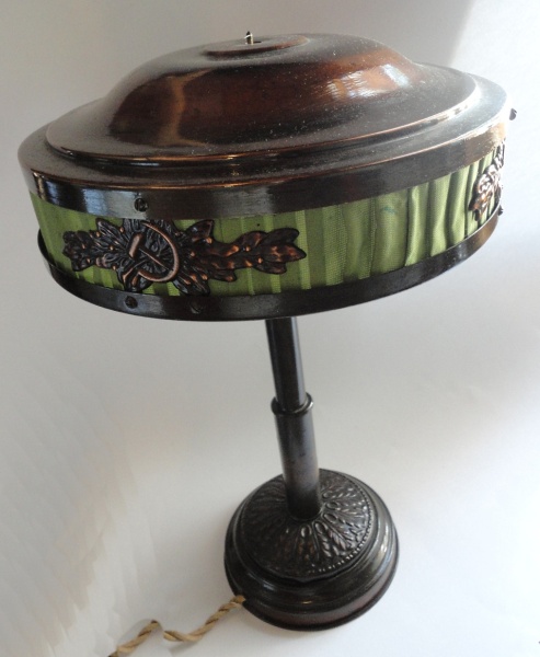 Настольная лампа, металлическая, декорированная чеканкой с орнаментом из дубовых листьев, поверх которых расположен серп и молот. Абажур затянут зеленым шелком, реставрировался в 1980-1981 гг.