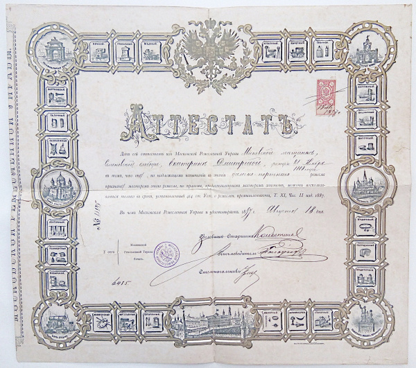 Аттестат № 13245 о признании Бурматовой Екатерины Дмитриевны мастером дамско-портновского ремесла. Московская Ремесленная Управа. 18 августа 1897 г.