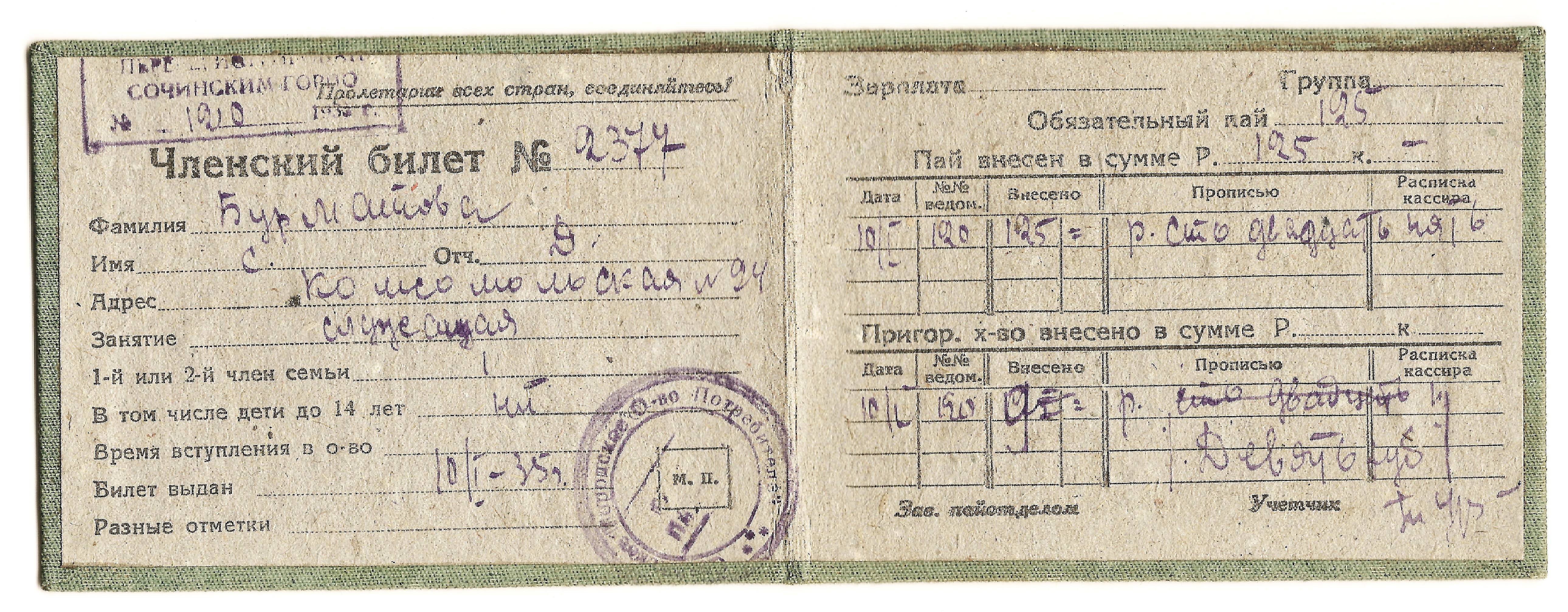 Паевой полнопайный членский билет № 2377 Бурматовой Е.Д., служащей. Сочинское общество потребителей. 10 января 1935 года.