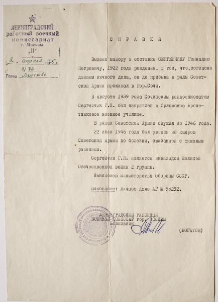 Справка-выписка из личного дела АГ № 53232 Сергейчика Г., пенсионера Министерства Обороны СССР, о его службе в армии и участии в Великой Отечественной войне. 2 апреля 1975 года.