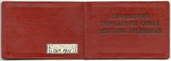 Депутатский билет № 137 Островской Екатерины Алексеевны, депутата Сочинского городского Совета депутатов трудящихся Краснодарского края 9-го созыва. Избрана 3 марта 1963 г. от избирательного округа № 137.