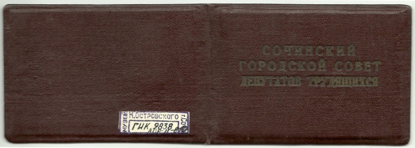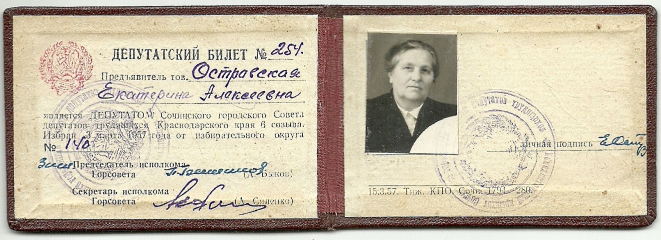 Депутатский билет № 254 Островской Екатерины Алексеевны, депутата Сочинского городского Совета депутатов трудящихся Краснодарского края 6-го созыва. Избрана 3 марта 1957 г. от избирательного округа № 140.