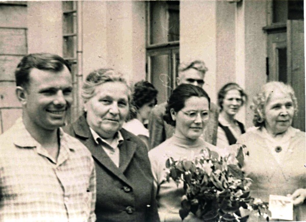 Юрий Гагарин в сочинском музее Н. Островского. 16 мая 1961 года. Фотография сюжетная. У входа в литературную часть музея стоят (слева направо): первый космонавт Земли Ю.А. Гагарин, директор музея, сестра писателя, Е.А. Островская, жена летчика-космонавта Валентина Гагарина, научный сотрудник музея А.П. Лазарева (в 1934-1936 гг. секретарь писателя Н. Островского). На втором плане ‒ сотрудники музея.