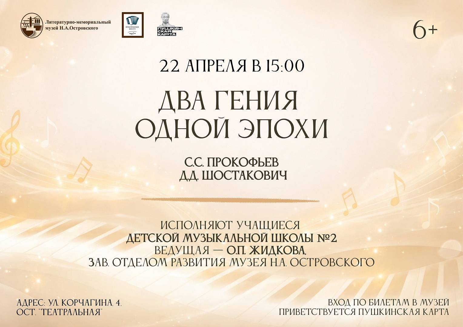 22 апреля в 15:00 в Музее Н.А. Островского состоится музыкальное событие, которое объединит два великих имени XX века. Музыкальная гостиная «Два гения одной эпохи: С.С. Прокофьев и Д.Д. Шостакович» приглашает всех, кто ценит глубокую и сильную музыку.