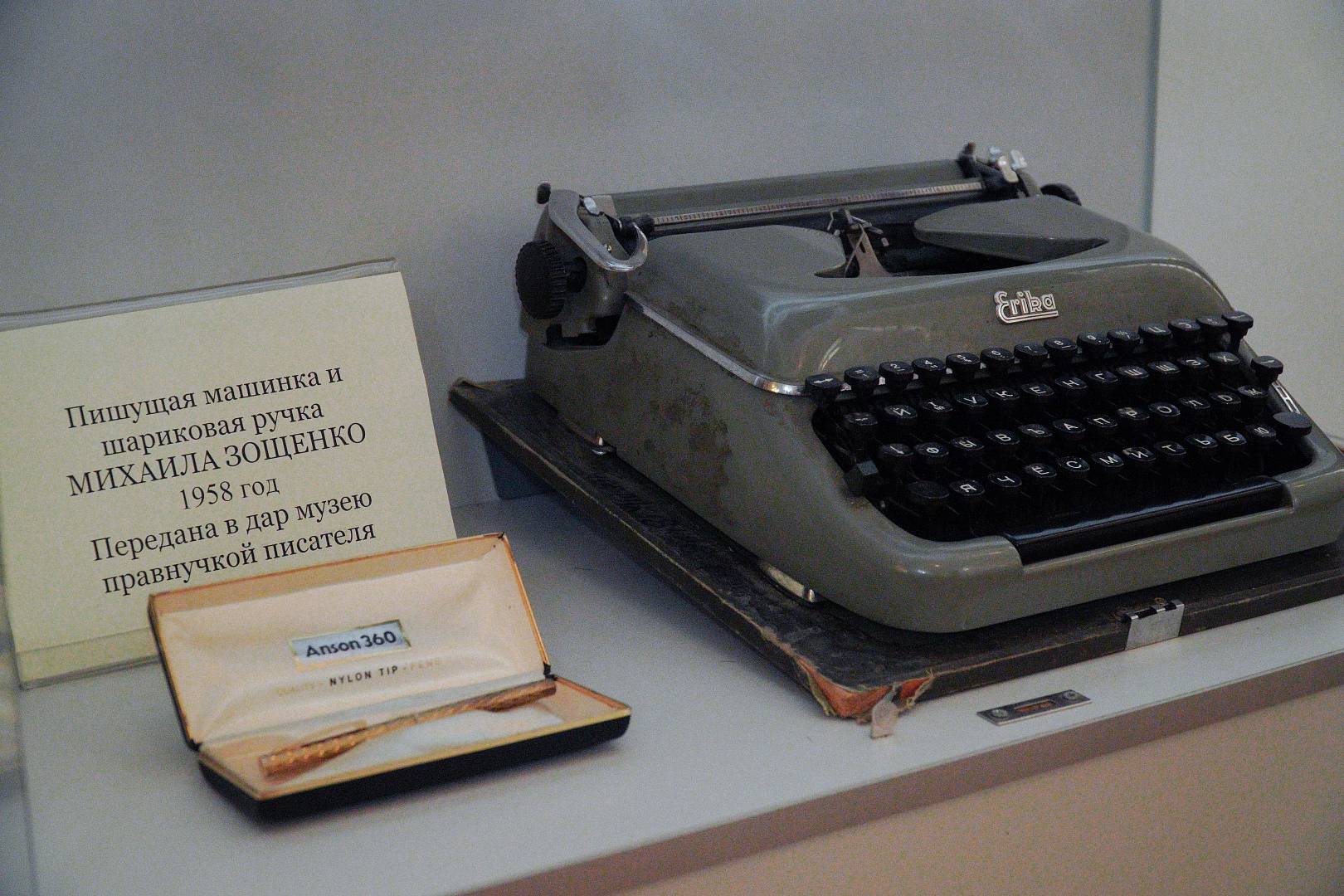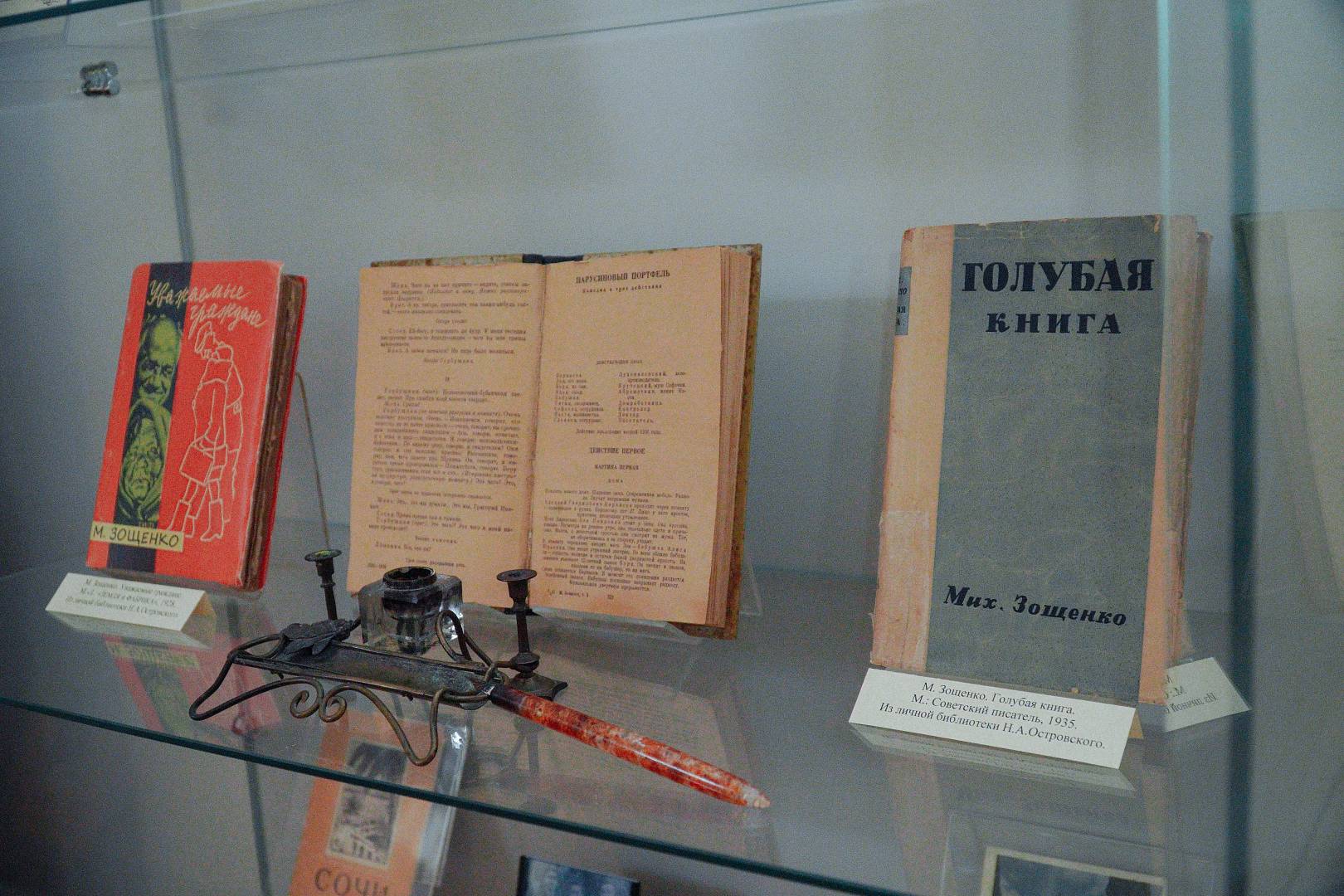 Уникальные экспонаты — пишущая машинка и шариковая ручка М. Зощенко (подарены правнучкой писателя), раритеты коллекции «Филокартия. Виды Сочи», редкие издания произведений М. Зощенко 1920-1930-х годов, журналы, в которых печатался прозаик — воссоздают хронику пребывания писателя в нашем городе.