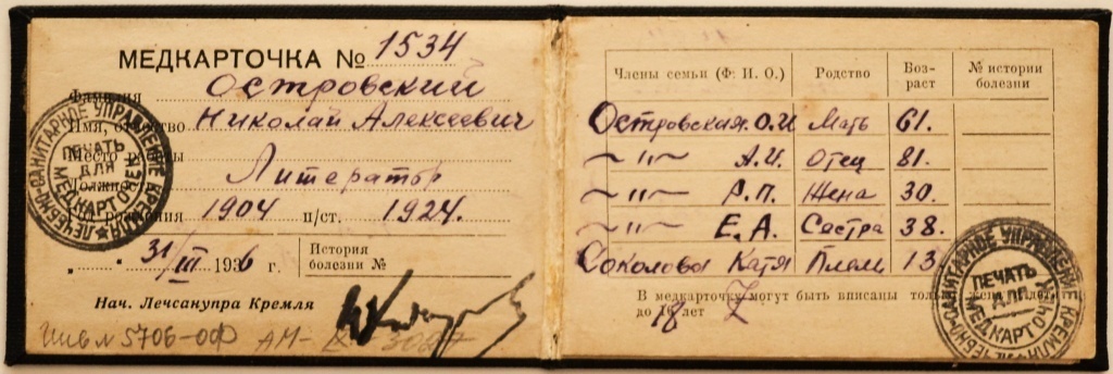 Медкарточка № 1534 литератора Н.А. Островского, год рождения 1904; партстаж с 1924.