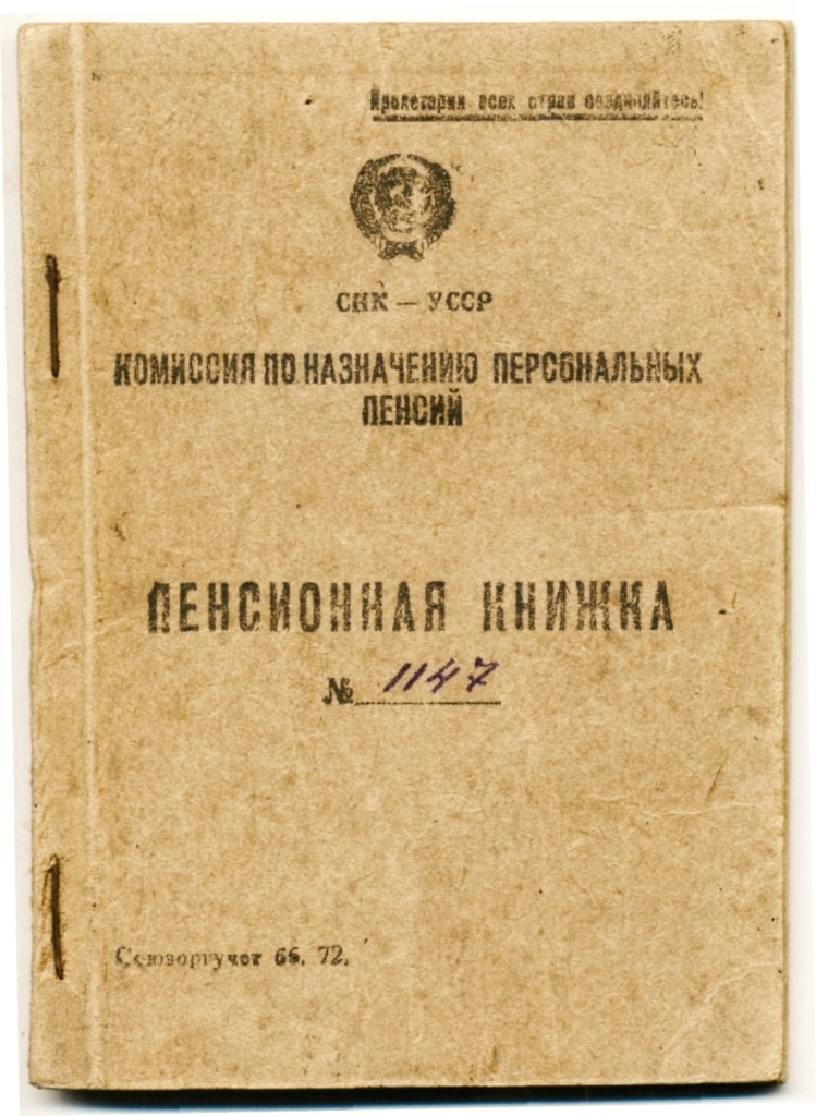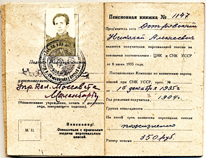 Пенсионная книжка №1147 Н.А.Островского, персонального пенсионера на основании Постановления ЦИК и СНК УССР от 8 июня 1935 года.