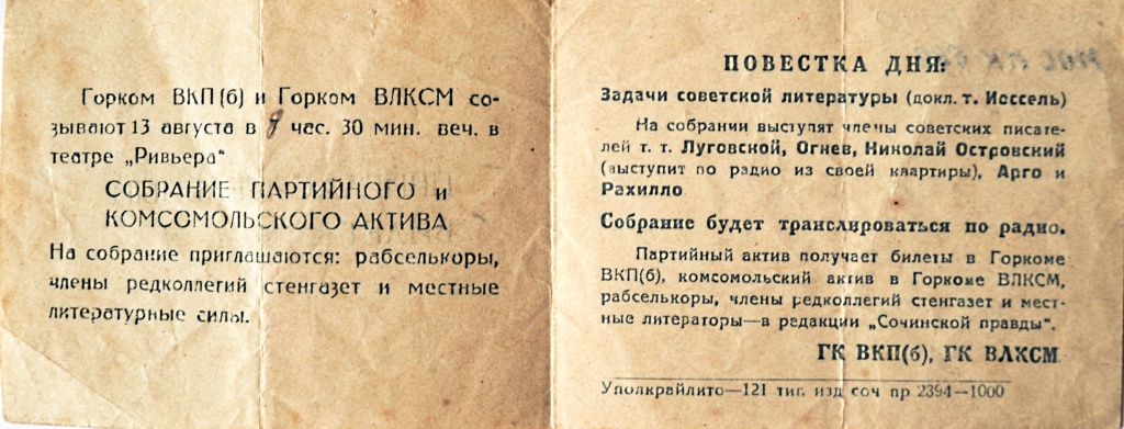 Собрание будет транслироваться по радио. На собрание приглашаются: рабселькоры, члены редколлегий стенгазет и местные литературные силы. Партийный актив получает билеты в Горкоме ВКП(б), комсомольский актив в Горкоме ВЛКСМ, рабселькоры, члены редколлегий стенгазет и местные литераторы ‒ в редакции «Сочинской правды». 13 августа 1935 г.