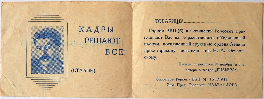 Пригласительный билет на торжественный объединенный пленум Горкома ВКП(б) и Сочинского горсовета, посвященный вручению ордена Ленина пролетарскому писателю тов. Н.А. Островскому, в театре «Ривьера» г. Сочи. 24 ноября 1935 г.