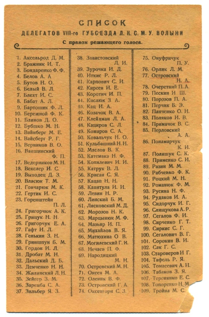 Список делегатов VIII-го Губернского съезда ЛКСМУ Волыни с правом решающего голоса.