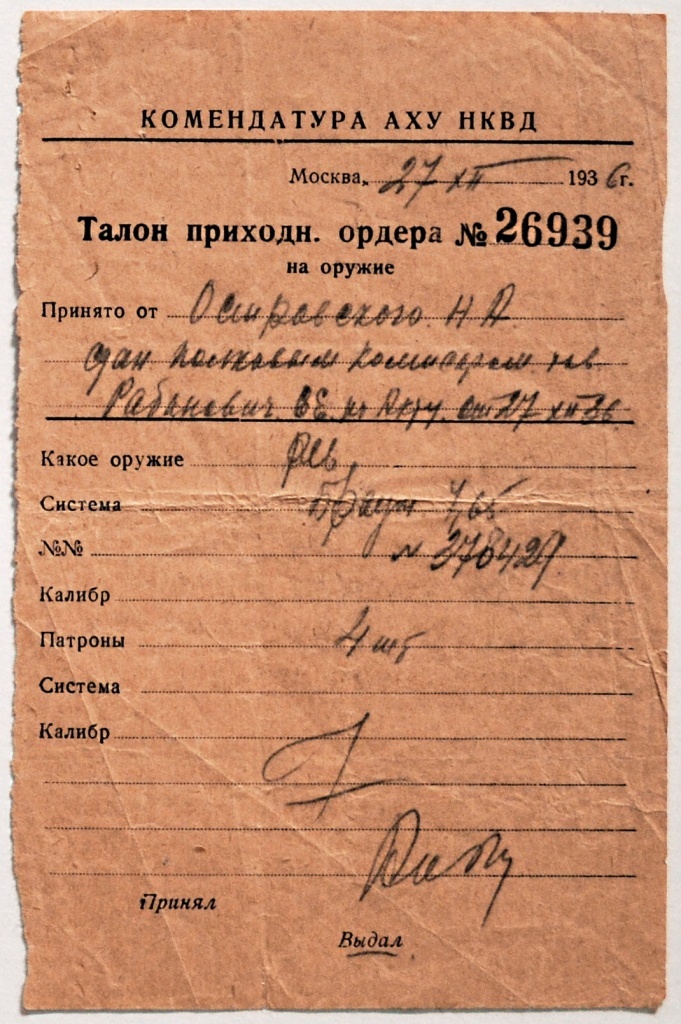 Талон приходного ордера № 26939 на оружие. Принято от Н.А. Островского. Сдан в комендатуру АХУ НКВД (Административно-хозяйственное Управление Народного Комиссариата Внутренних Дел) полковым комиссаром тов. Рабиновичем С.Е. по акту от 27/XII-36 г. револьвер системы Браунинг № 378429, калибр 4,65; 4 патрона. Москва. 27 декабря 1936 г.