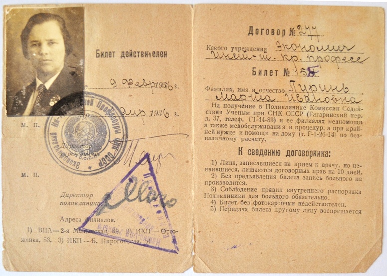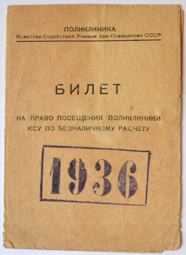 Билет на право посещения по безналичному расчету Мартой Ивановной Пуринь поликлиники Комиссии Содействия Ученым при Совнаркоме СССР на 1936 год. Действителен с 9 февраля по 9 апреля 1936 года.