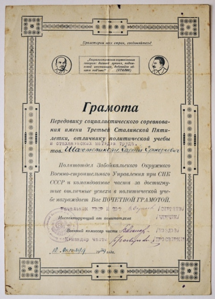 Грамота передовика социалистического соревнования имени третьей Сталинской пятилетки, отличника политической учебы и стахановских методов труда, Шахмеликьян К.Г. Политотдел Забайкальского Окружного Военно-санитарного Управления при СНК СССР. 12 октября 1939 года.