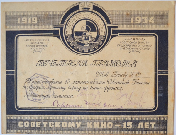 Почетная грамота лучшему борцу на кино-фронте, Попову Г.Ф., в ознаменование 15-летия Советской Кинематографии (1919-1934).