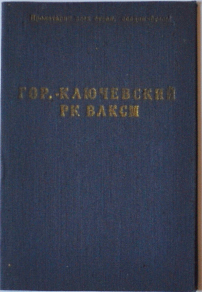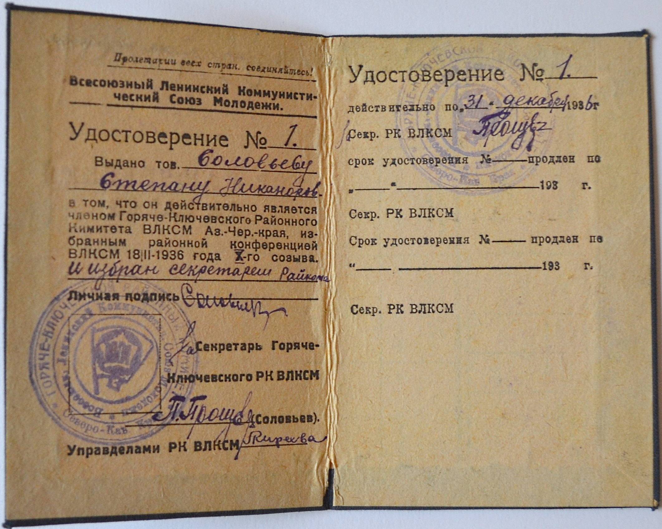 Удостоверение № 1 Соловьева Степана Никаноровича, избранного секретарем Горяче-Ключевского районного комитета ВЛКСМ 18 февраля 1936 года на районной конференции ВЛКСМ X-го созыва. Действительно по 31 декабря 1936 года.