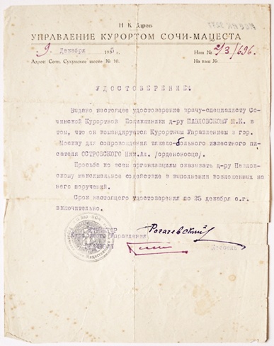 Удостоверение М.К. Павловского, врача-специалиста Сочинской Курортной Поликлиники, командированного в Москву до 25 декабря 1935 года для сопровождения писателя-орденоносца Н. Островского. Управление Курортом Сочи-Мацеста. 9 декабря 1935 г.