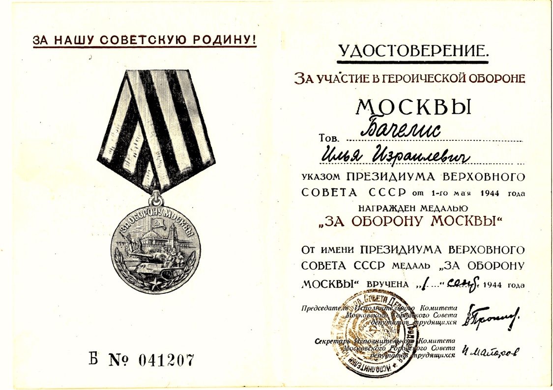 Удостоверение за участие в героической обороне Москвы /серия Б No041207/. Указом Президиума Верховного Совета СССР от 1 мая 1944 года И.И. Бачелис награжден медалью «За оборону Москвы» 1 сентября 1944 года.