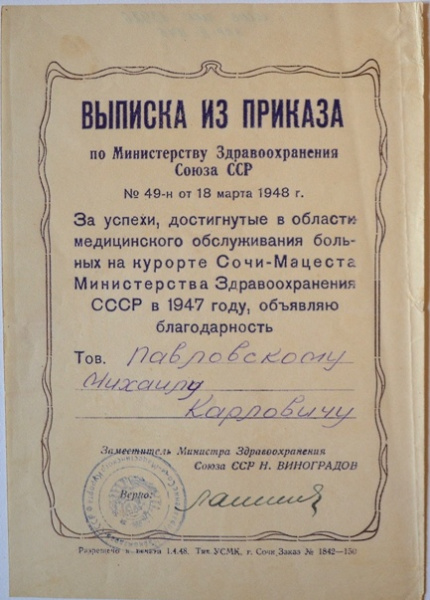 Выписка из Приказа по Министерству Здравоохранения Союза ССР № 49-н от 18 марта 1948 года. Благодарность М.К. Павловскому за успехи, достигнутые в области медицинского обслуживания больных на курорте Сочи-Мацеста Министерству Здравоохранения СССР в 1947 году.