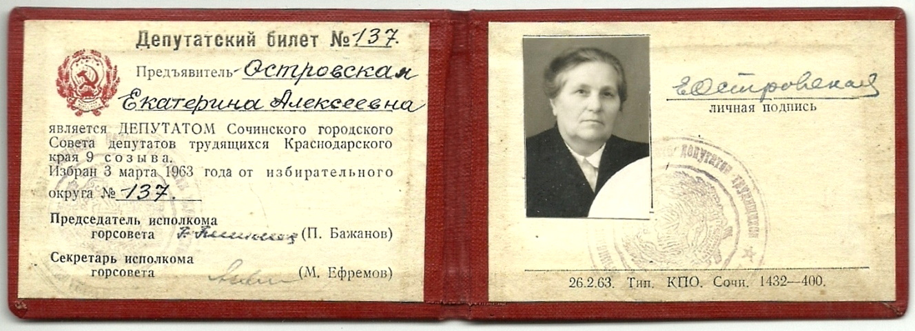 Депутатский билет № 137 Островской Екатерины Алексеевны, депутата Сочинского городского Совета депутатов трудящихся Краснодарского края 9-го созыва. Избрана 3 марта 1963 г. от избирательного округа № 137.