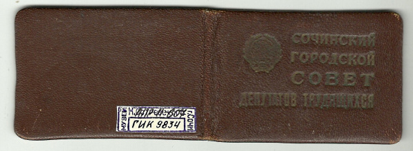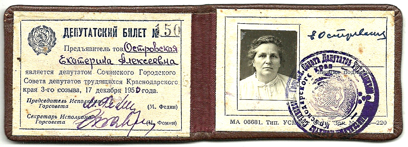 Депутатский билет № 50 Островской Екатерины Алексеевны, депутата Сочинского городского Совета депутатов трудящихся Краснодарского края 3-го созыва. 17 декабря 1950 г.