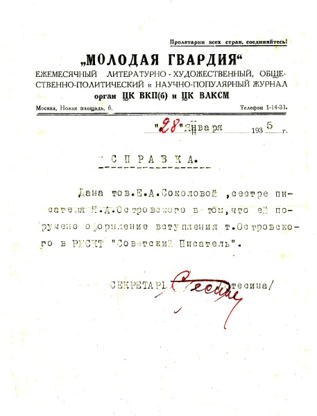 Справка, выданная Соколовой Екатерине Алексеевне, сестре писателя Н.А. Островского, на право оформления вступления т. Островского в РЖСКТ «Советский писатель». Секретариат журнала «Молодая гвардия». 28 января 1935 года.