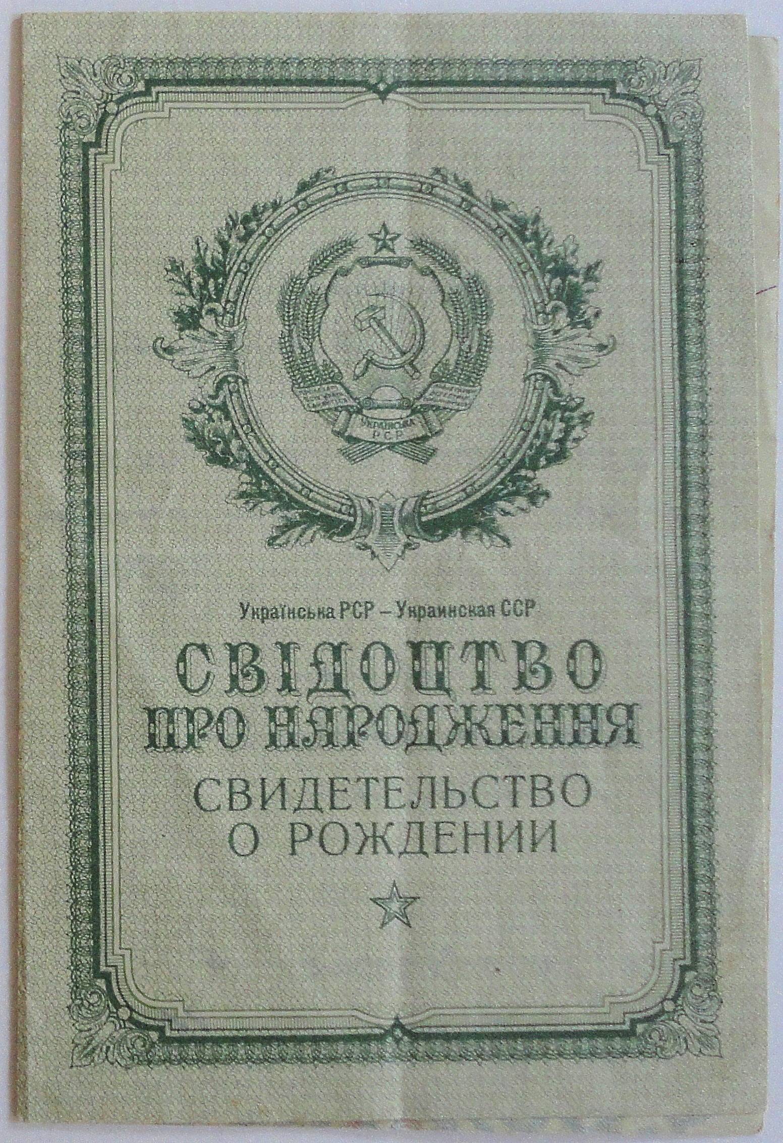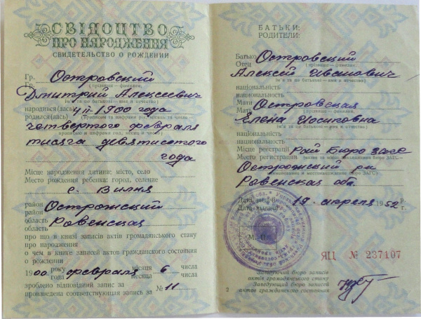 Свидетельство о рождении Островского Дмитрия Алексеевича 4 февраля 1900 года в селе Вилия Острожского района Ровенской области. Дата выдачи 19 апреля 1952 года. Повторное. Украинская ССР. /На украинском и русском языках/.