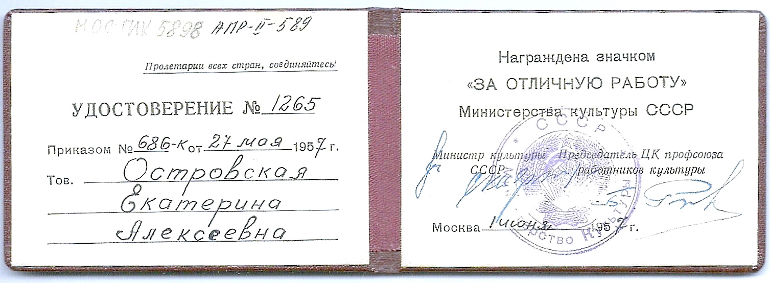 Удостоверение № 1265 Островской Екатерины Алексеевны к значку «За отличную работу». Приказ № 686-к Министерства культуры СССР от 27 мая 1957 года. Москва. 1 июня 1957 года.