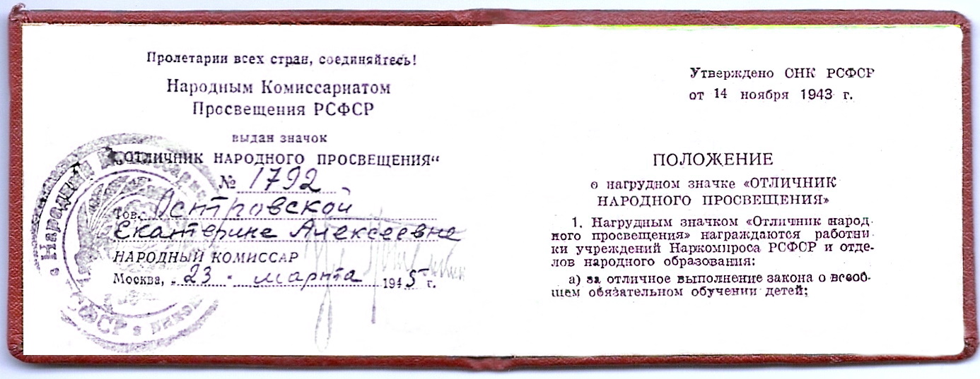 Удостоверение № 1792 Островской Екатерины Алексеевны к значку «Отличник народного просвещения». 23 марта 1945 года. Народный Комиссариат Просвещения РСФСР.