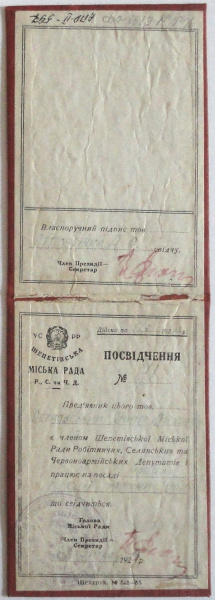 Удостоверение № 71 Дмитрия Алексеевича Островского, члена Шепетовского Совета рабочих, крестьянских и красноармейских депутатов трудящихся. 1929 год. Действительно по 1 октября 1930 года. На украинском языке.
