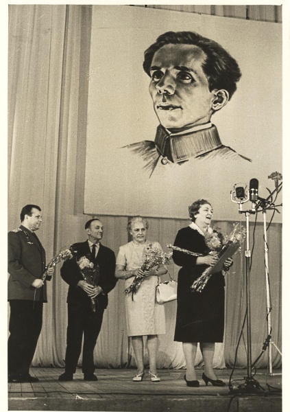 Выступление Р.П. Островской, жены писателя, на Втором Пленуме ЦК ВЛКСМ, по решению которого первым лауреатом премии Ленинского комсомола был назван Николай Островский. Фотография сюжетная (слева направо): первый космонавт Земли Ю.А. Гагарин, друг писателя П.Н. Новиков, Герой Советского Союза Л.М. Павличенко, у микрофона Р.П. Островская. Москва. Дворец пионеров. 2 февраля 1967 г. Москва. На обороте – дарственная надпись Р.П. Островской: «Госмузею Николая Островского в Сочи. Р. Островская.