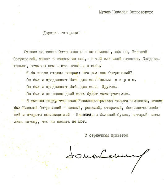 Семенов Ю. Отзыв о Н. Островском. Машинопись. 1 л.