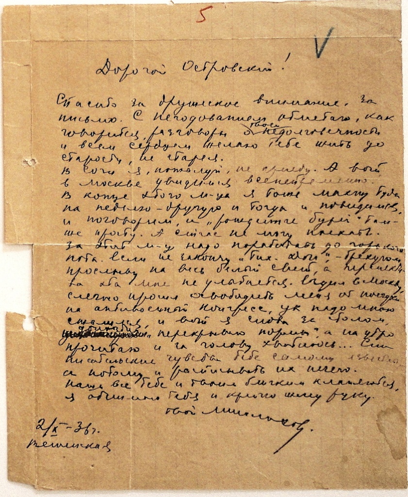 Письмо к Н.А. Островскому от 2 октября 1936 г. из станицы Вешенской Азово-Черноморского края в Сочи.