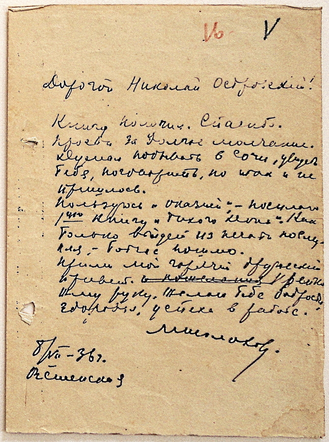Письмо к Н.А. Островскому от 8 июля 1936 г. из станицы Вешенской Азово-Черноморского края в Сочи.