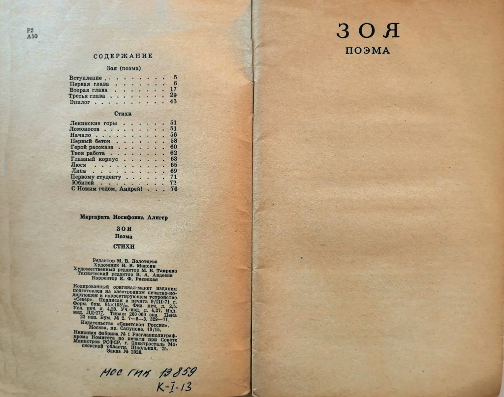 Алигер Маргарита. Зоя. Поэма. Стихи. М.: Советская Россия, 1971.