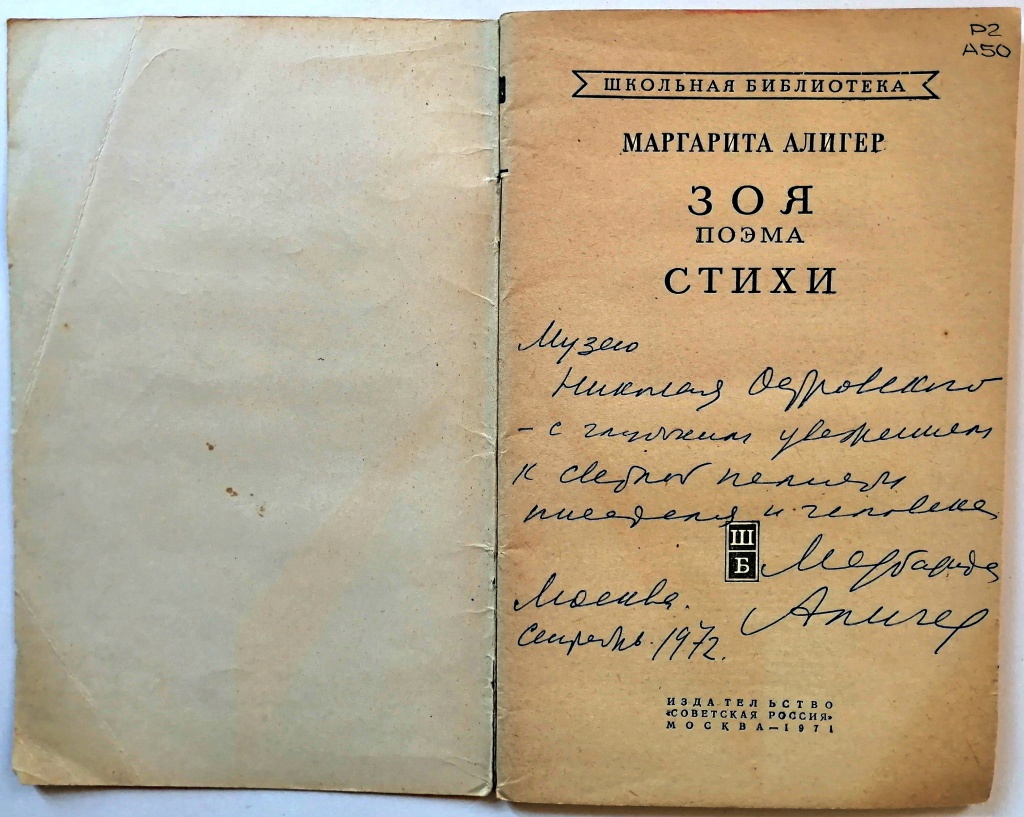 С автографом автора: «Музею Николая Островского — с глубоким уважением к светлой памяти писателя и человека. Маргарита Алигер. Москва. Сентябрь 1972.».