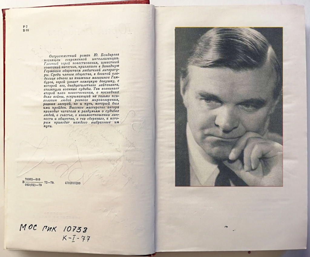 С автографом автора: «В Государственный литературно-мемориальный музей Н.А. Островского — с солдатской почестью перед подвигом автора романа „Как закалялась сталь”. Ю. Бондарев. 30.3.79 г.».