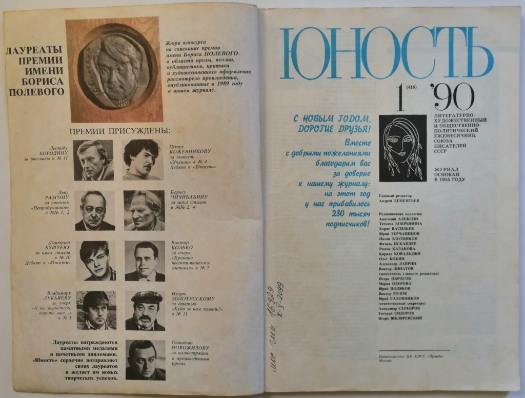 Бородин Л. Женщина в море. Повесть // Юность. Журнал. 1990. № 1. С.6-32. На 6-й странице — автограф автора: «Ольге Ивановне в дни сочинских встреч с благодарностью. 21.V.93. Бородин».